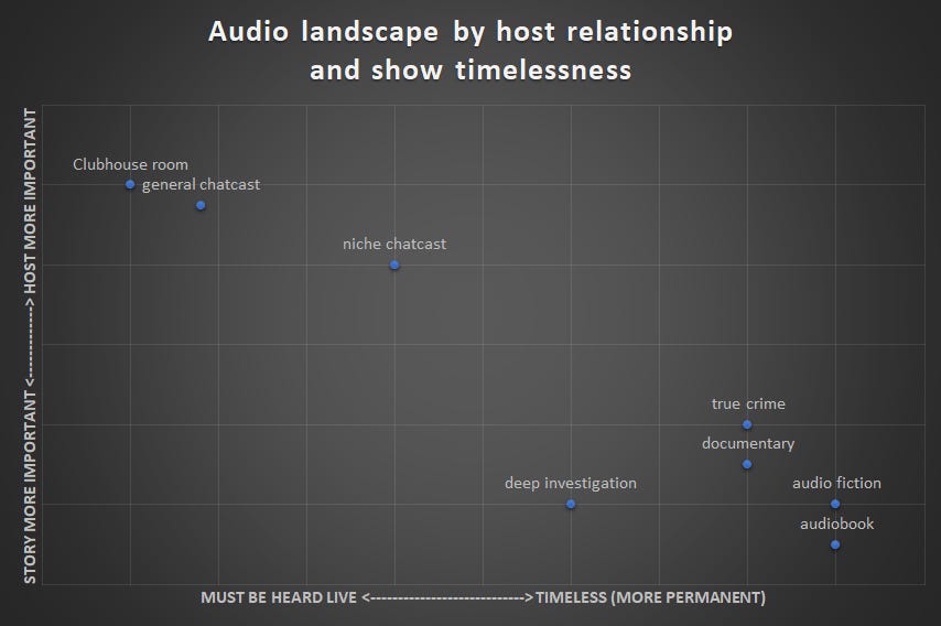 I believe we’ll see the same kind of brand cementation in audioland. So for fun, I’ve created a graph that I think helps us see where things will land. The X-Axis is about the longevity of the work. Must it be heard live or can you listen in 10 years and enjoy it just as much? The Y-Axis is about the importance of the host. Does the person speaking feel like someone you know and have inside jokes with, or, so long as the person doesn’t put you to sleep with a monotone, you don’t care who’s speaking as long as the story is good?